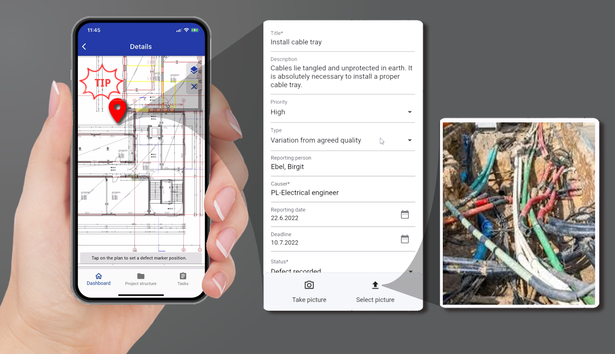 - Mark the position of the defect on the open building plan with the tip of your finger, enter any relevant information and include some photos.